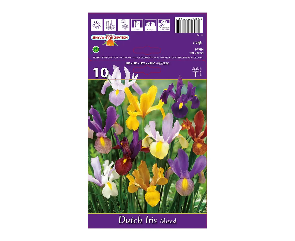 Dutch Iris Mixed – ეს არის ჰოლანდიური ყვავილების ნაზავი, რომელიც მოიცავს ყვითელ, იისფერ, ლურჯ და თეთრ ფერებს.