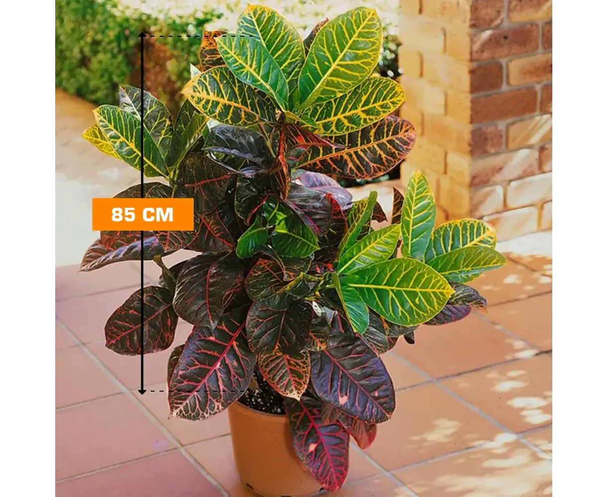 ფერადოვანი და გამორჩეული შიდა მცენარე, რომელიც გამოირჩევა კაშკაშა ფოთლებით — მუქი მწვანე, ყვითელი, ნარინჯისფერი და წითელი ტონებით. მისი მტკიცე ღეროები და ფართე, კონტრასტული ფოთლები შესანიშნავად ამდიდრებს ინტერიერს და ქმნის ტროპიკულ ატმოსფეროს. წარმოდგენილია 3PP (სამღერო) ფორმატში, რაც სიძლიერესა და სიმჭიდროვეს უზრუნველყოფს.