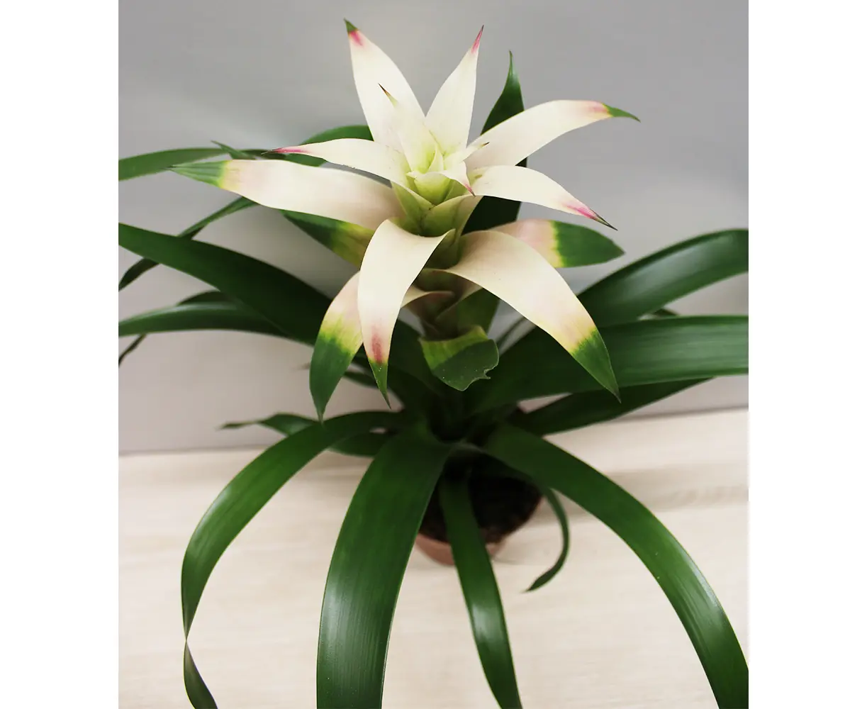 გუზმანია არის ტროპიკული, ეგზოტიკური მცენარე, რომელიც გამოირჩევა კაშკაშა და ეფექტური ყვავილობითა და ლამაზად ჩამოყალიბებული, ღრმა მწვანე ფოთლებით. მისი ყვავილები წარმოდგენილია ნათელ ფერებში — წითელი, ყვითელი ან ნარინჯისფერი, რომლებიც ქმნიან ძლიერ ვიზუალურ კონტრასტს ფოთლებთან. მისი უნიკალური ვიზუალი და მარტივი მოვლა ხდის მას იდეალურ მცენარედ ნებისმიერი სახლის ან ოფისის ინტერიერისთვის. გუზმანია ასევე განსაკუთრებით პოპულარულია დეკორატიული გაფორმების ელემენტად, რადგან მისი ფერადი ვერტიკალური ყვავილი ქმნის დახვეწილ და თბილ ატმოსფეროს.