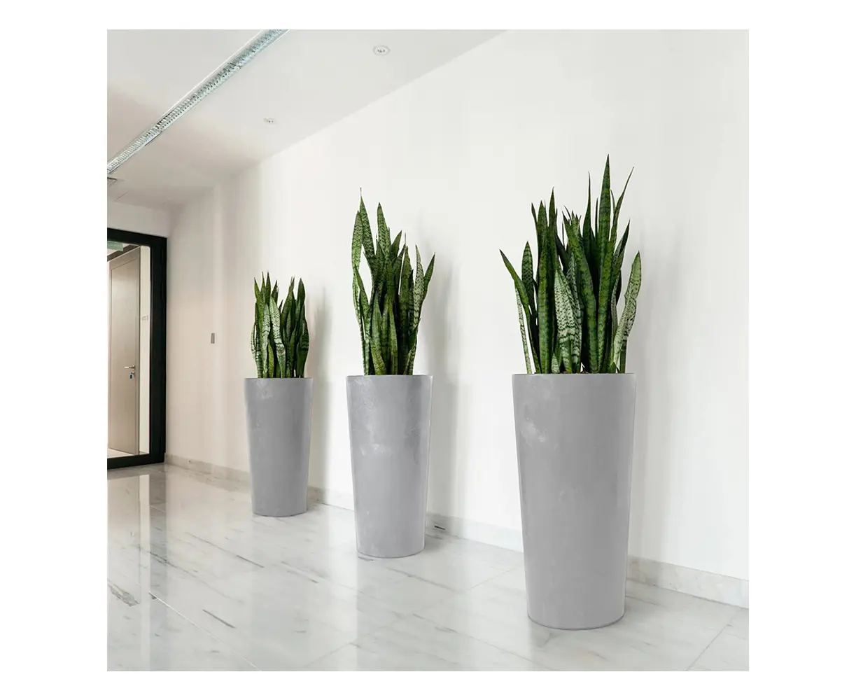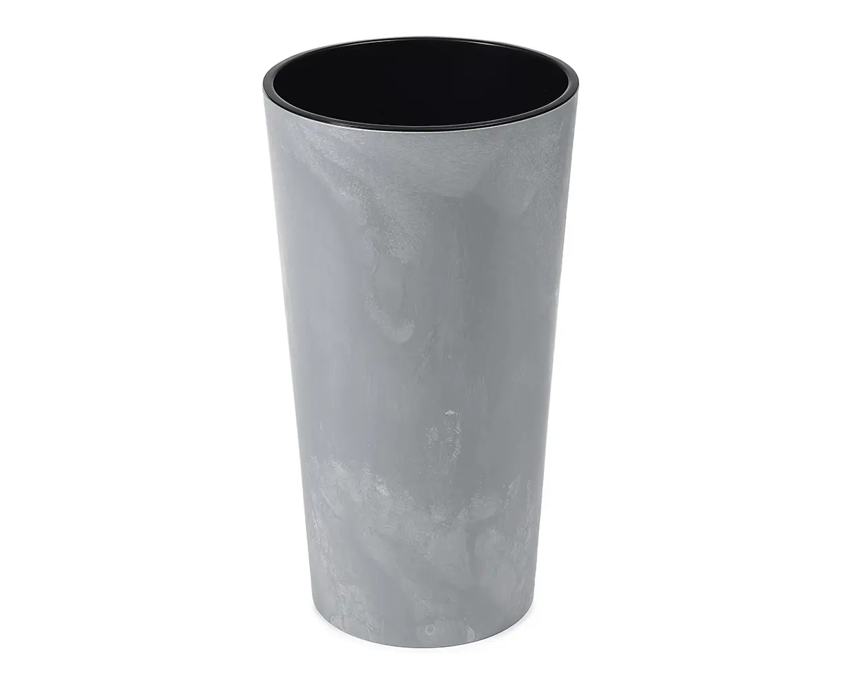 მაღალი პლასტმასის ქოთანი Lilia ბეტონის ეფექტით რეციკლირებული პლასტმასისგან. ქოთანს აქვს კონუსური ფორმა და მოხსნადი შავი პლასტმასის კაშპო. კომპლექტში შედის კაშპო, რომელიც უზრუნველყოფს მცენარეების სათანადო დატენიანებას და ამცირებს ნიადაგის მოხმარებას.