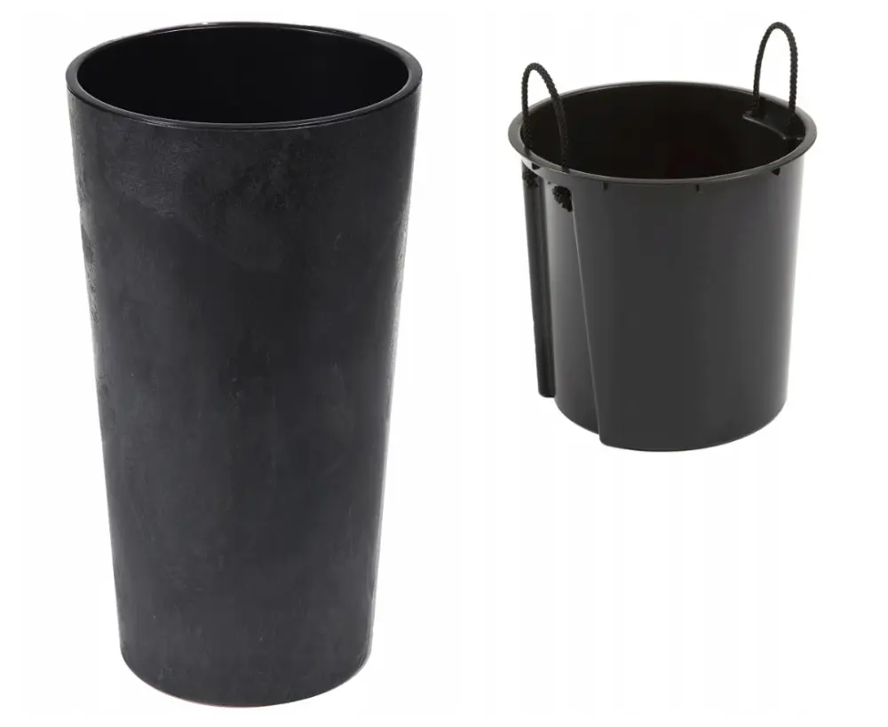 მაღალი პლასტმასის ქოთანი Lilia ბეტონის ეფექტით რეციკლირებული პლასტმასისგან. ქოთანს აქვს კონუსური ფორმა და მოხსნადი შავი პლასტმასის კაშპო. კომპლექტში შედის კაშპო, რომელიც უზრუნველყოფს მცენარეების სათანადო დატენიანებას და ამცირებს ნიადაგის მოხმარებას.