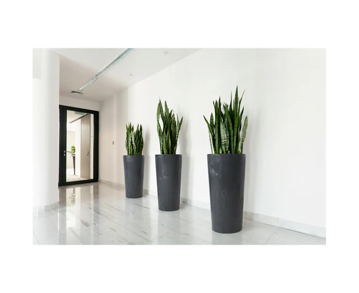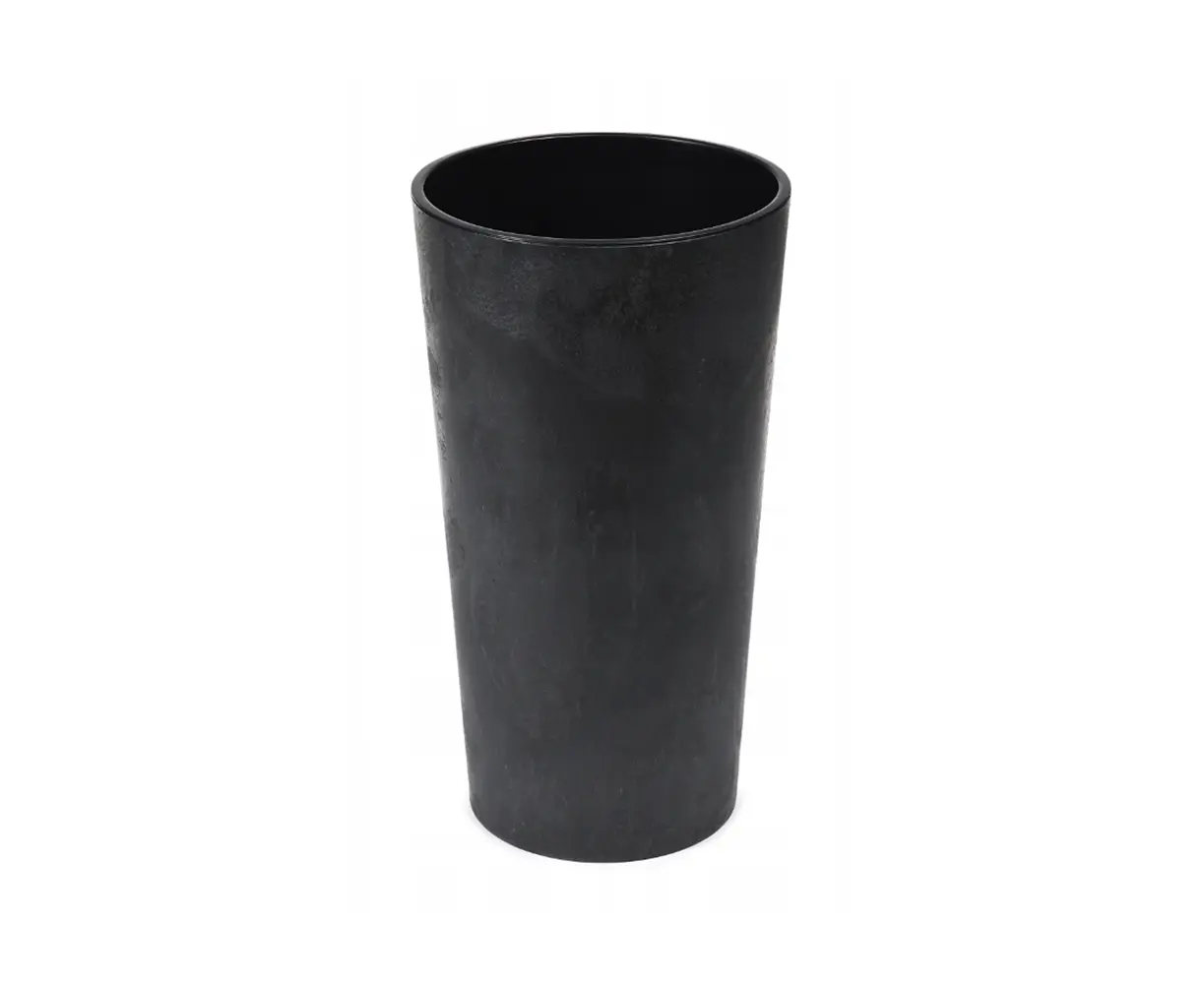 მაღალი პლასტმასის ქოთანი Lilia ბეტონის ეფექტით რეციკლირებული პლასტმასისგან. ქოთანს აქვს კონუსური ფორმა და მოხსნადი შავი პლასტმასის კაშპო. კომპლექტში შედის კაშპო, რომელიც უზრუნველყოფს მცენარეების სათანადო დატენიანებას და ამცირებს ნიადაგის მოხმარებას.