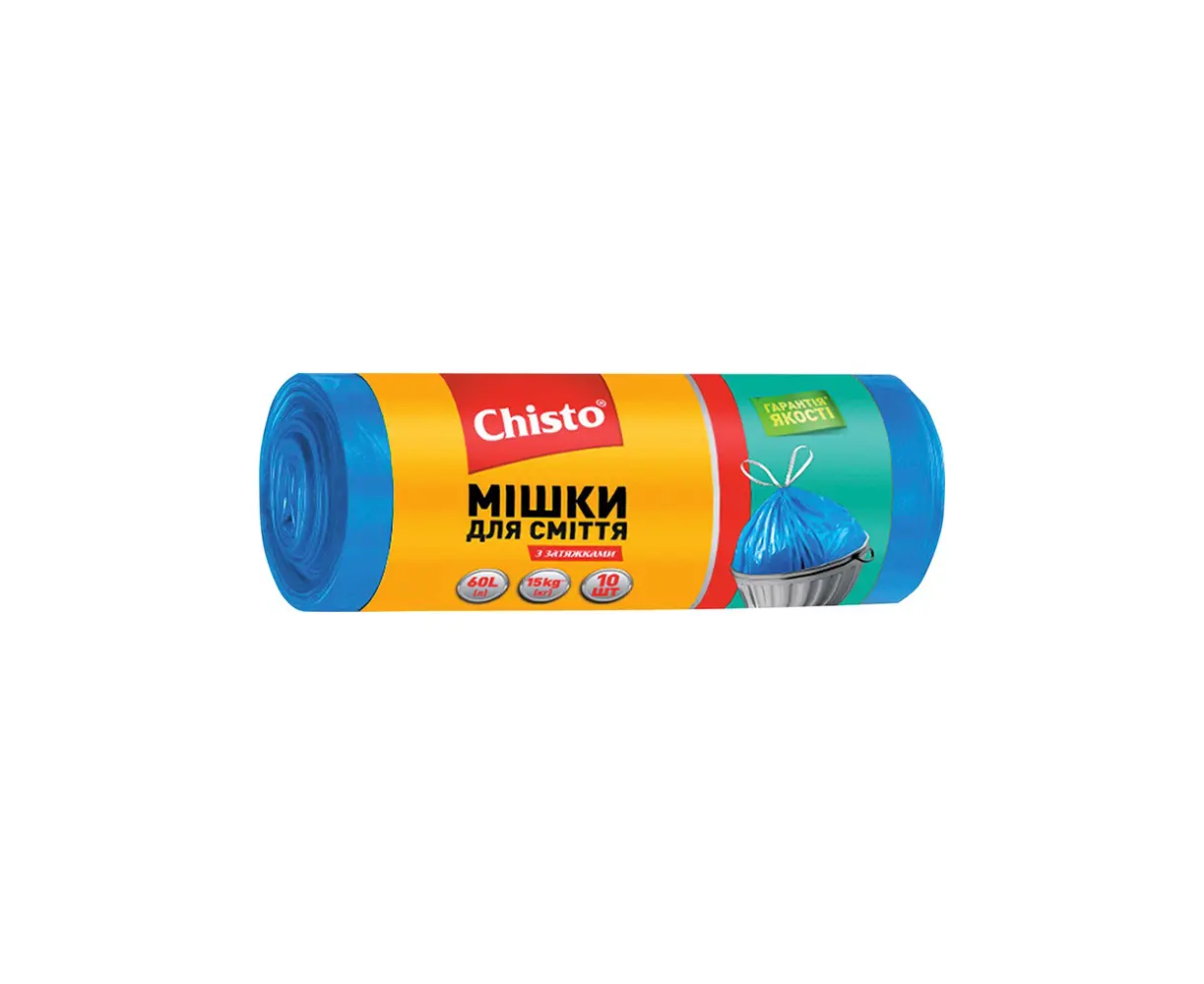 Chisto Strong ნაგვის პარკი ლენტით (10 ცალი) 60 ლიტრ მოცულობით, დამზადებულია მყარი მასალით, განკუთვნილია ჩვეულებრივი ნაგვის დასაყარავად, დამატებით ლენტით, რაც აჩქარებს გამოყენებას.