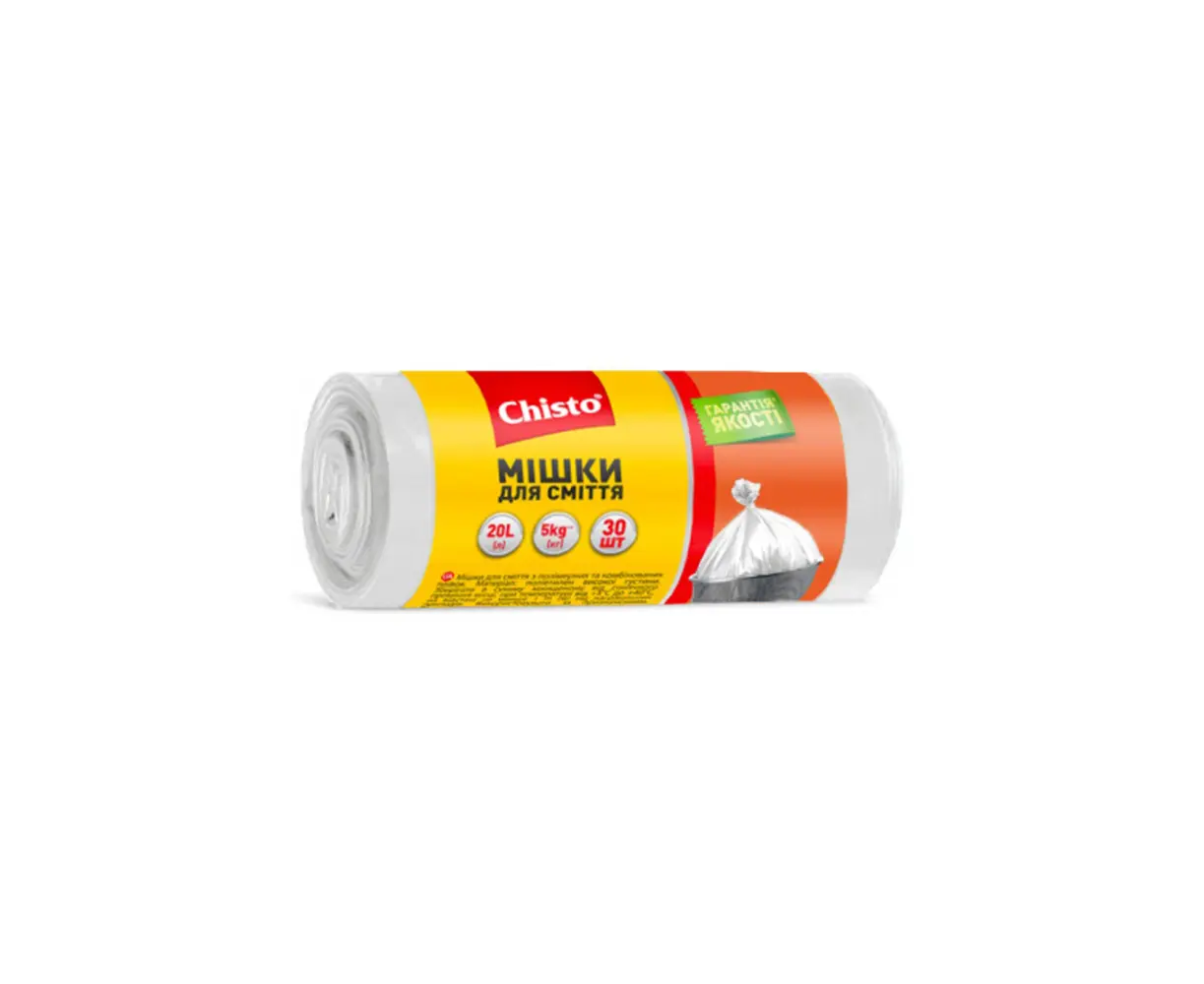 Chisto Strong ტომრები ნაგვისთვის (15 ცალი) 20 ლიტრ მოცულობით, განკუთვნილია მსუბუქი და საშუალო ნაგვის მოსაყარეებისთვის, მყარი და საიმედო კონსტრუქციით.