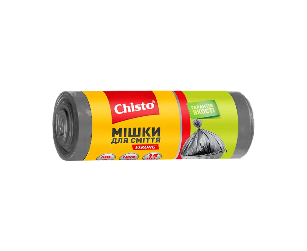 Chisto Strong ტომრები ნაგვისთვის (15 ცალი) 60 ლიტრ მოცულობით, დამზადებულია ძლიერი მასალებისგან, იდეალურია მძიმე ნაგვის მოსაყარეებისთვის.