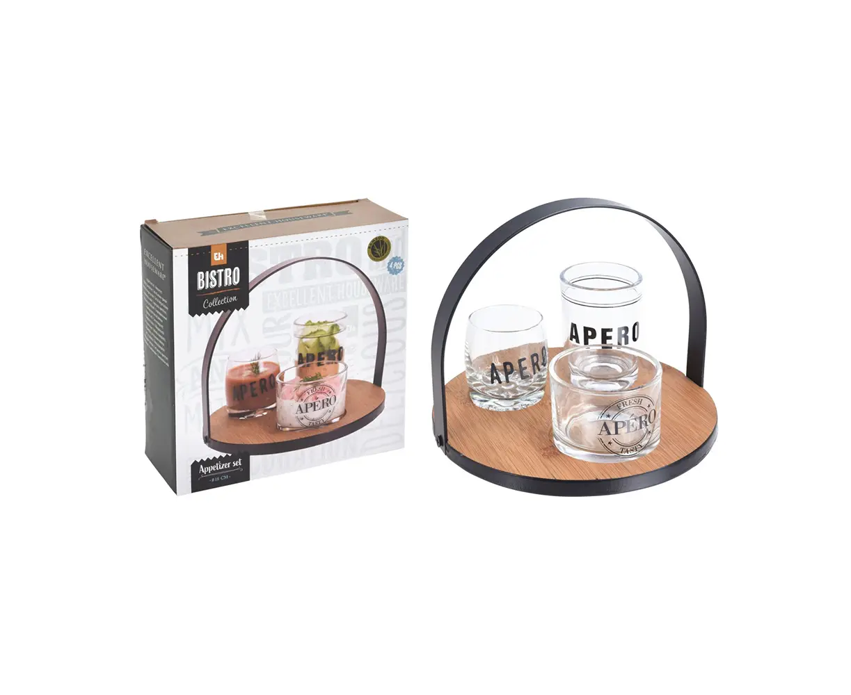 კონტეინერთა ნაკრები Koopman 210000490 (გამჭვირვალე/ყავისფერი/შავი) მოიცავს პატარა, საშუალო და დიდ თასებს, ასევე ბაზას, დამზადებული ბამბუკით, მეტალით და მინით.