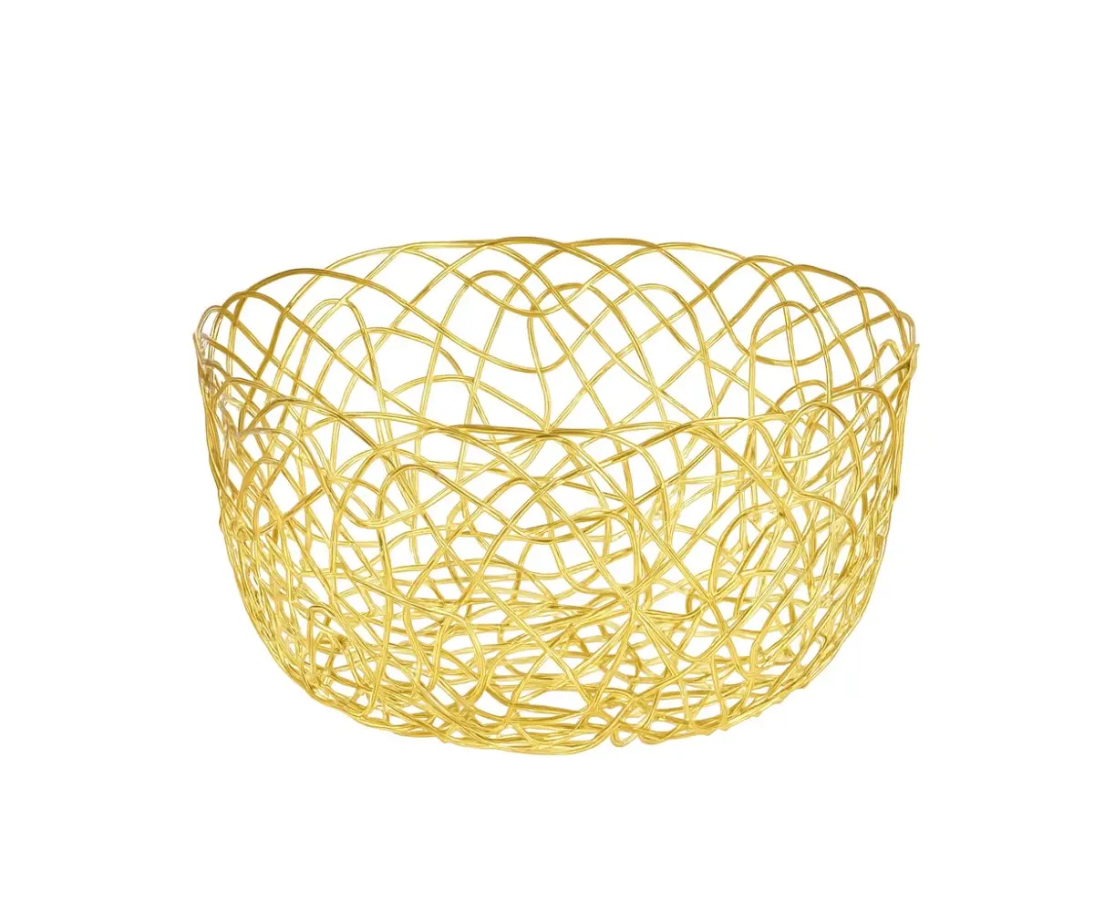 ეს თანამედროვე და სტილური დეკორატიული კალათა გამოირჩევა დახვეწილი დიზაინითა და მსუბუქი, გამჭვირვალე სტრუქტურით. იდეალურია ხილის, დეკორის ან სხვა ნივთების ესთეტიკური და ორგანიზებული განთავსებისთვის. მისი უნიკალური ფორმა და გადაჯაჭვული მეტალის კონსტრუქცია სუფრას ან ინტერიერს ანიჭებს ელეგანტურ და თანამედროვე იერს. გამძლე მასალა უზრუნველყოფს ხანგრძლივ მომსახურებას და მარტივ მოვლას.