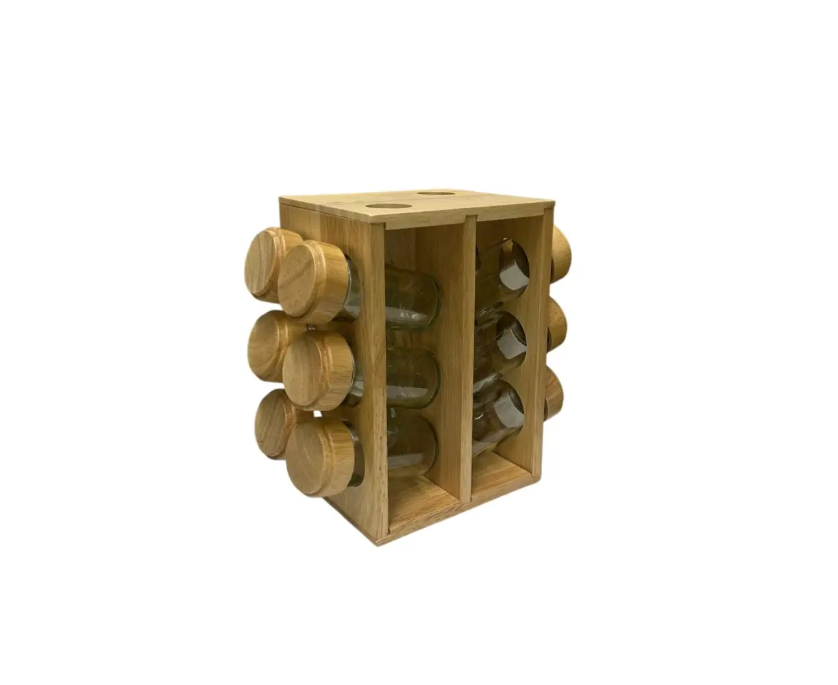 ამ სადგამის ბუნებრივი ფერი და დახვეწილი სტილი იდეალურად ერგება ნებისმიერი სამზარეულოს ინტერიერს.მისი პრაქტიკული დიზაინი საშუალებას გაძლევთ სანელებლები მოწესრიგებულად და კომფორტულად მოათავსოთ. ხის სტენდი სიმყარესა და სტაბილურობას უზრუნველყოფს, ხოლო გამჭვირვალე ქილები კომფორტულ გამოყენებას. ნაკრებში შედის 6 ცალი სანელებლების ქილა.
