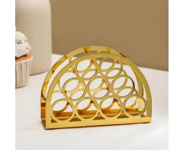 ეს ელეგანტური სასალფეთქე დამზადებულია მეტალისგან და მოპირკეთებულია ოქროსფერი დაფარვით, რაც მას დახვეწილ და თანამედროვე იერს აძლევს. მის ინტერიერში გამჭვირვალე ორნამენტული ფორმები სიმსუბუქესა და ორიგინალურობას მატებს. პრაქტიკული და სტილური აქსესუარი იდეალურია როგორც სახლის, ისე კაფესა და რესტორნის სერვირებისათვის. ხელსაყრელი ზომა უზრუნველყოფს კომფორტულ გამოყენებას ყოველდღიურად და განსაკუთრებულ შემთხვევებშიც.