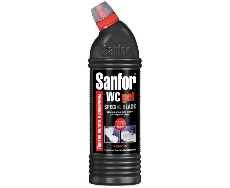 გამწმენდი და სადეზინფექციო საშუალება Sanfor უნაკლოდ აშორებს კირს და ხელს უშლის მის წარმოქმნას ტუალეტის თასებში, აცილებს ჟანგს და ასევე ადვილად ასუფთავებს ზედაპირს ცხიმის ლაქებისგან, ობისგან, საპნის ზოლებისგან. სქელი ფორმულის გამო იგი თანაბრად ვრცელდება და არ იშლება დახრილ ზედაპირებზე.