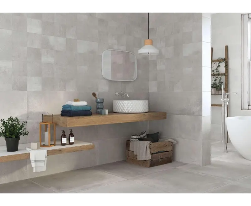 ესპანური კერამიკული ფილა Halcon Ceramicas, რომლის წყალობითაც პატარა სივრცეები უფრო ფართოდ გამოიყურება და ქმნის უწყვეტობის ეფექტს.
