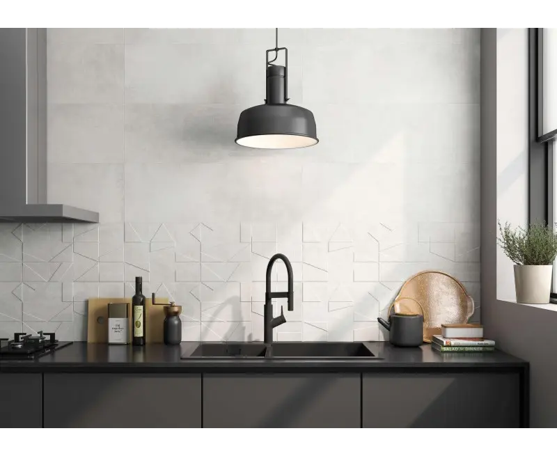 ესპანური კერამიკული ფილა Halcon Ceramicas, რომლის წყალობითაც პატარა სივრცეები უფრო ფართოდ გამოიყურება და ქმნის უწყვეტობის ეფექტს.