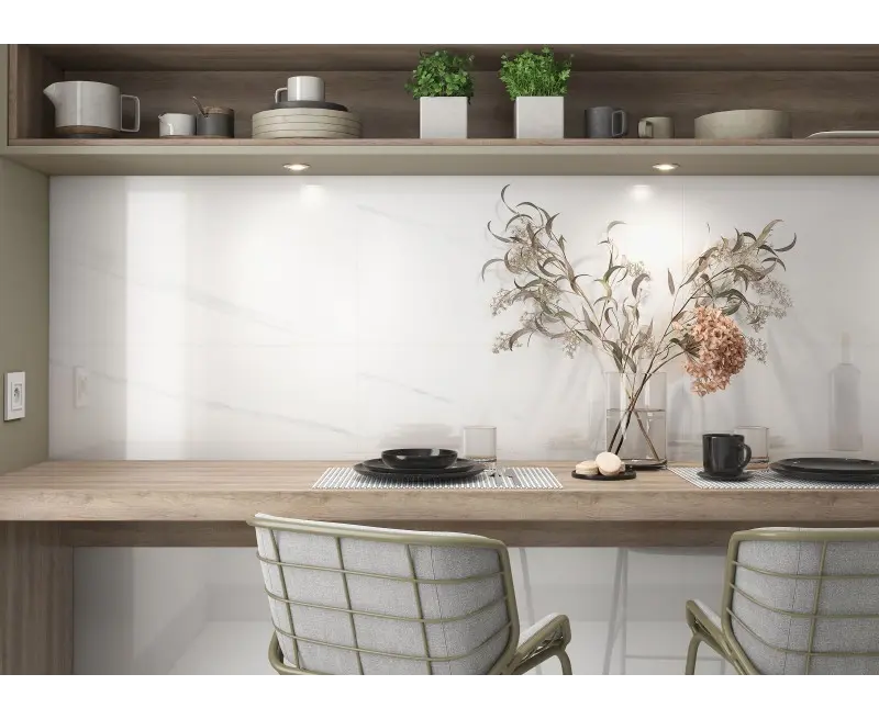 ესპანური ფილა Halcon Ceramicas, რომლის წყალობითაც პატარა სივრცეები უფრო ფართოდ გამოიყურება და ქმნის უწყვეტობის ეფექტს.