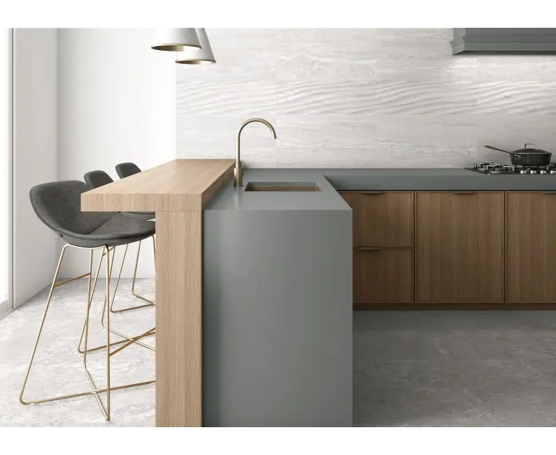 ესპანური კერამიკული ფილა Halcon Ceramicas, რომლის წყალობითაც პატარა სივრცეები უფრო ფართოდ გამოიყურება და ქმნის უწყვეტობის ეფექტს.