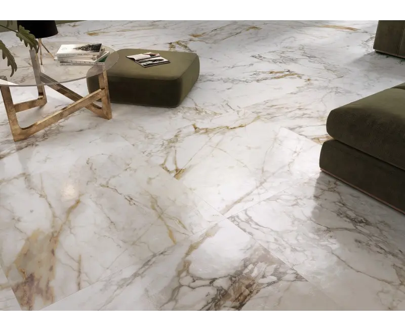 ესპანური კერამიკული ფილა Halcon Ceramicas, რომლის წყალობითაც პატარა სივრცეები უფრო ფართოდ გამოიყურება და ქმნის უწყვეტობის ეფექტს.