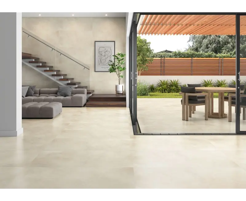 ესპანური კერამიკული ფილა Halcon Ceramicas, რომლის წყალობითაც პატარა სივრცეები უფრო ფართოდ გამოიყურება და ქმნის უწყვეტობის ეფექტს.