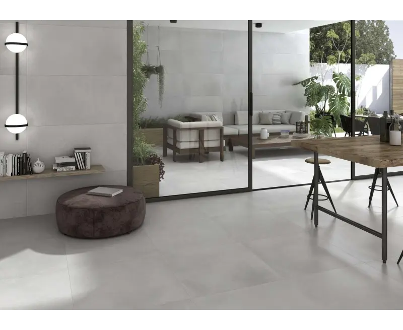 ესპანური კერამიკული ფილა Halcon Ceramicas, რომლის წყალობითაც პატარა სივრცეები უფრო ფართოდ გამოიყურება და ქმნის უწყვეტობის ეფექტს.