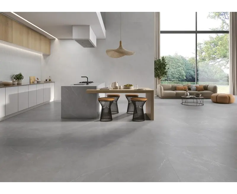 ესპანური კერამიკული ფილა Halcon Ceramicas, რომლის წყალობითაც პატარა სივრცეები უფრო ფართოდ გამოიყურება და ქმნის უწყვეტობის ეფექტს.