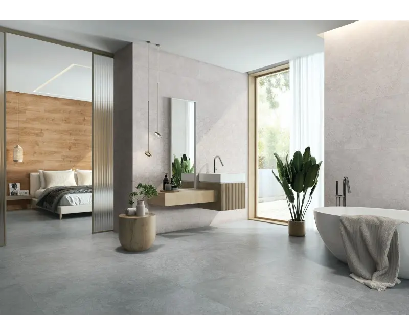 ესპანური კერამიკული ფილა Halcon Ceramicas, რომლის წყალობითაც პატარა სივრცეები უფრო ფართოდ გამოიყურება და ქმნის უწყვეტობის ეფექტს.