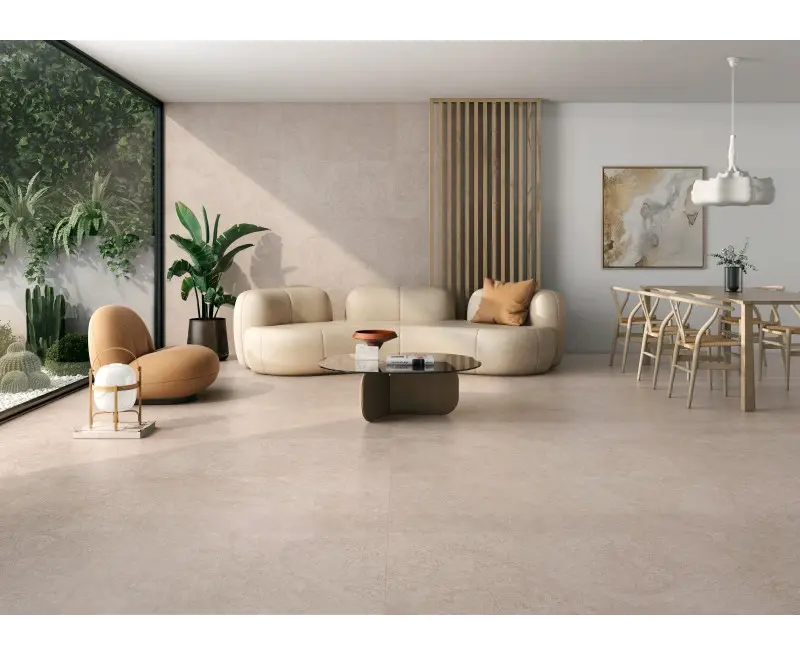 ესპანური კერამიკული ფილა Halcon Ceramicas, რომლის წყალობითაც პატარა სივრცეები უფრო ფართოდ გამოიყურება და ქმნის უწყვეტობის ეფექტს.