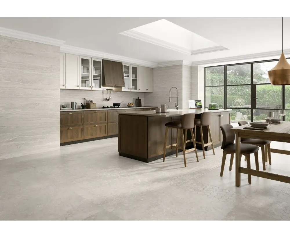 ესპანური კერამიკული ფილა Halcon Ceramicas, რომლის წყალობითაც პატარა სივრცეები უფრო ფართოდ გამოიყურება და ქმნის უწყვეტობის ეფექტს.
