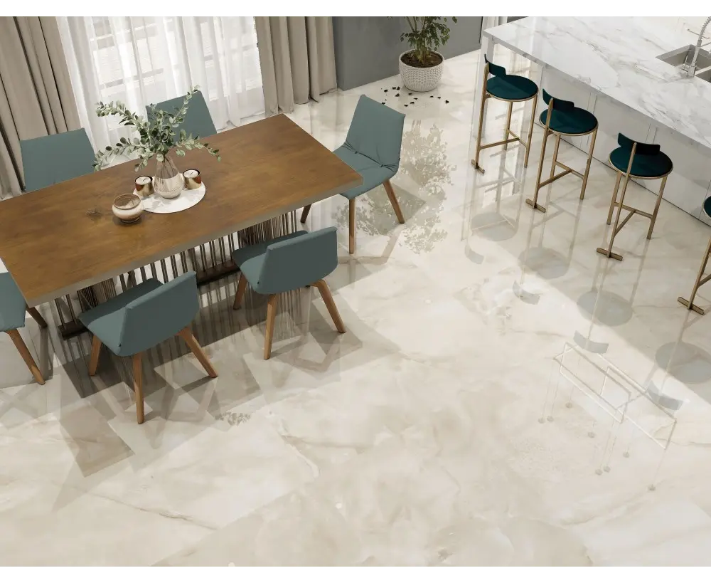 ესპანური კერამიკული ფილა Halcon Ceramicas, რომლის წყალობითაც პატარა სივრცეები უფრო ფართოდ გამოიყურება და ქმნის უწყვეტობის ეფექტს.