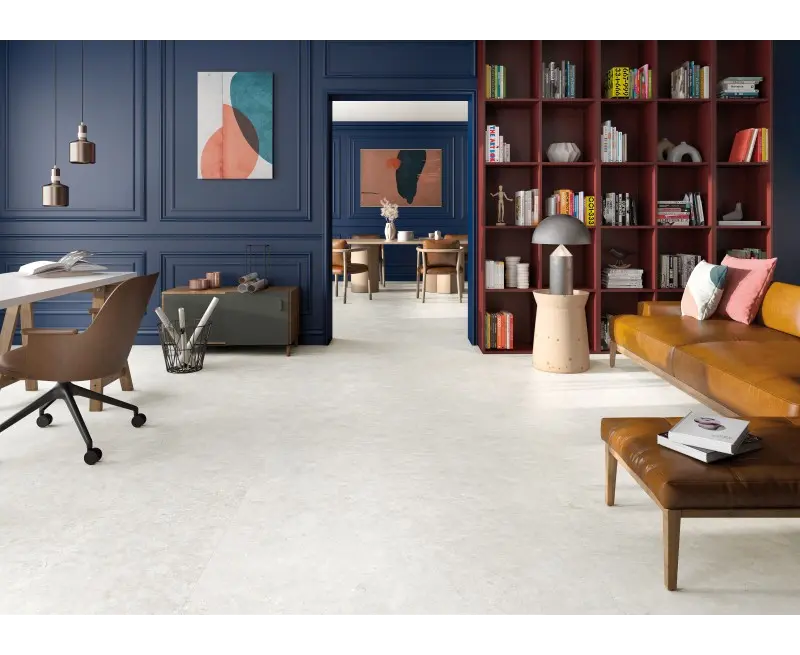 ესპანური კერამიკული ფილა Halcon Ceramicas, რომლის წყალობითაც პატარა სივრცეები უფრო ფართოდ გამოიყურება და ქმნის უწყვეტობის ეფექტს.