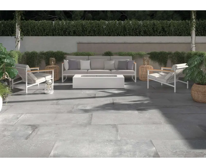 ესპანური კერამიკული ფილა Halcon Ceramicas, რომლის წყალობითაც პატარა სივრცეები უფრო ფართოდ გამოიყურება და ქმნის უწყვეტობის ეფექტს.